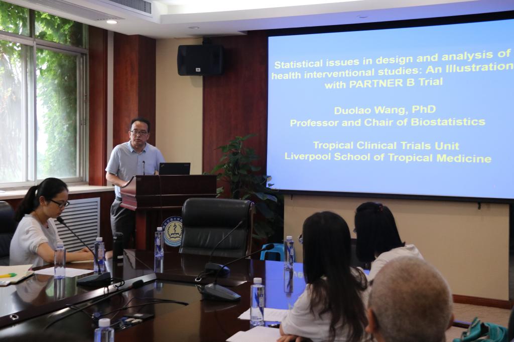 会上,王多劳教授以“Statistical issues in design and analysis of health interventional studies: An Illustration with PARTNER B Trial”为题,讲授了临床试验设计的原则、要求和流程。他以新英格兰医学杂志发表的一项心血管临床试验为例,重点讲解了试验设计中的统计分析方法和试验报告撰写要点。报告结束后,参会师生就样本量计算、检验效能确定、试验终止原则等与王老师进行深入交流。
