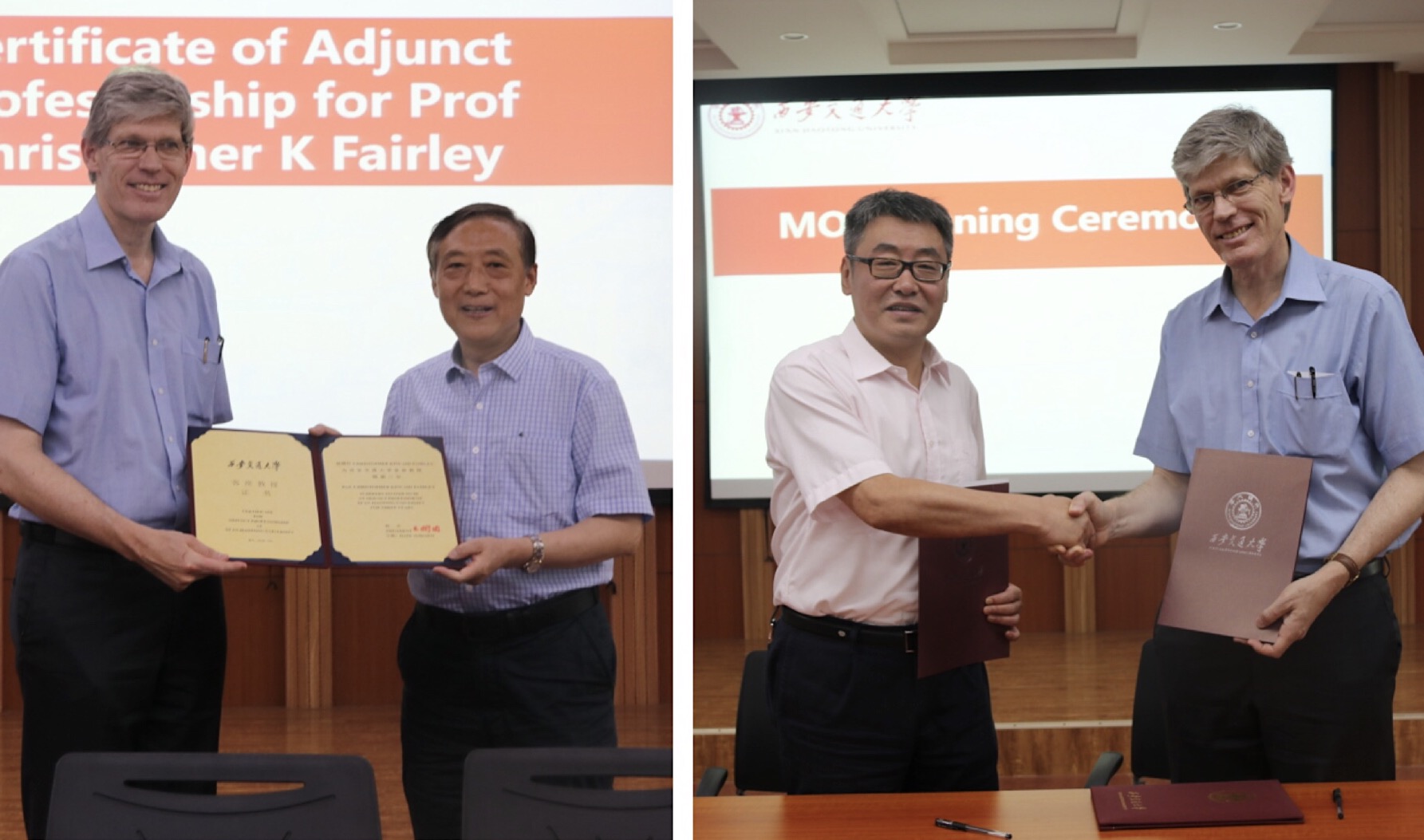 颜虹副校长为Fairley教授颁发西安交通大学客座教授聘书,庄贵华院长与Fairley教授签订合作备忘录。