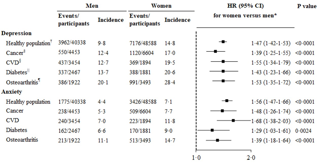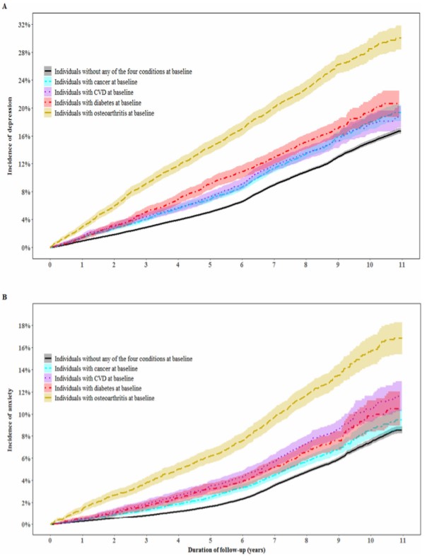 该研究是一项大样本长期随访研究,在随访的不同时间点,对长期患有癌症、心血管疾病、糖尿病和骨关节炎与精神疾病(抑郁症和焦虑症)的相关性进行分析。研究表明:在健康人群中,抑郁症和焦虑症的累积发病率分别为12.5%和5.9%,长期患有上述四种慢性疾病的患者患抑郁症的风险分别是健康人群的1.19倍、1.08倍、1.18倍和1.94倍,其患焦虑症的风险分别是健康人群的1.11倍、1.26倍、1.10倍和2.01倍。其中,骨关节炎患者患抑郁症和焦虑症的风险最高。癌症与抑郁症的关联和糖尿病与焦虑症的关联在男性中比女性更明显,其他关联在男女之间没有显著差别。