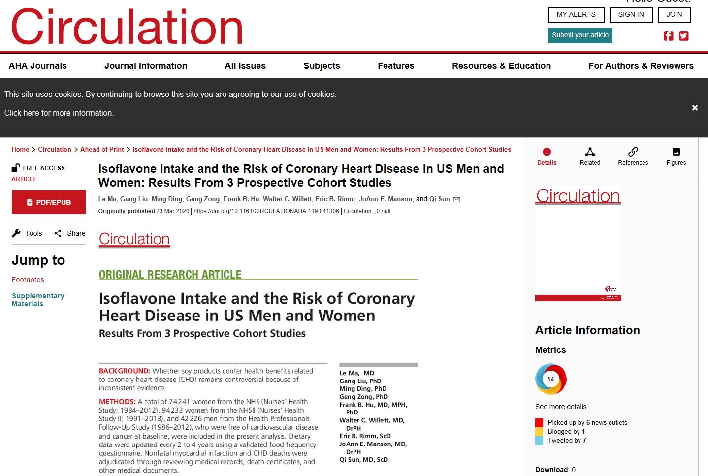 该项研究是西安交通大学公共卫生学院马乐教授与哈佛大学公共卫生学院Qi Sun教授、Frank B. Hu教授、Walter C. Willett 教授、Eric B. Rimm 教授、JoAnn E. Manson教授等合作完成。西安交通大学为该论文的第一作者单位。其研究论文“Isoflavone Intake and the Risk of Coronary Heart Disease in US Men and Women”以“Original Article”的形式在国际权威医学期刊Circulation(《循环》)在线发表。该期刊影响因子23.05,在国际血管领域期刊中排名第一。