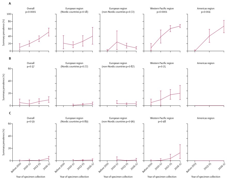该研究发现与大环内酯类抗生素耐药相关的突变在生殖支原体样本中的总流行率为35.5%,并且流行率从2010年前的10.0%上升到2016-17年的51.4%。在世卫组织西太平洋和美洲地区的样本中,与大环内酯类抗药性相关的突变流行率显著高于世卫组织欧洲地区的样本。与氟喹诺酮类药物耐药相关的突变在生殖支原体样本中的总检出率为7.7%,随着时间的推移,流行率没有明显变化,但西太平洋地区的流行率明显高于欧洲地区。总体而言,在生殖支原体样本中,与大环内酯类耐药相关的突变和与氟喹诺酮类耐药相关的突变的流行率为2.8%,双重耐药的流行率没有随着时间的推移发生显著变化,也没有因地理区域而有显著差异。