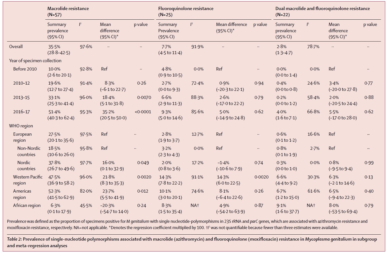 该研究在PubMed、Embase和Medline上搜索了截至2019年1月7日以任何语言发表的与大环内酯类和氟喹诺酮耐药相关的生殖支原体突变流行率的数据。利用随机效应meta分析来汇总估计耐药的流行率,并按WHO地区和时间段进行了亚组分析和Meta回归分析。