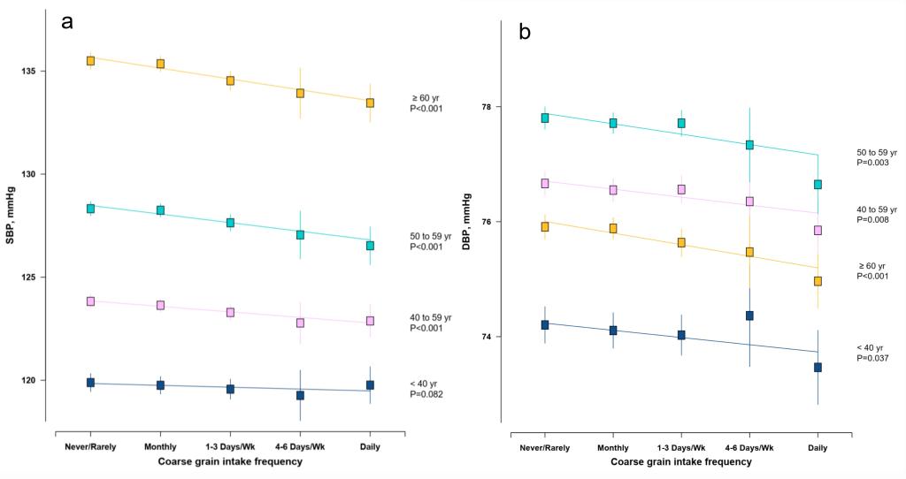 与牛津大学纳菲尔德人口健康系杜怀东研究员等合作,刘鑫课题组利用“中国慢病前瞻性队列研究”的基线数据,在中国10个地区43万无临床诊断高血压的中国成年居民中,在矫正了包括体力活动、室外温度、体质指数等混杂因素后,发现杂粮摄入频率与血压水平显著负相关,此外,与“几乎不吃”杂粮相比,“每天摄入”杂粮者,其“未知晓的高血压”(无临床诊断,但收缩压/舒张压 ≥ 140/90 mmHg)的患病风险低22%,分层分析提示该关联规律在年龄大于40岁人群及男性中更显著。该研究在国际上首次基于大规模队列数据报道了杂粮摄入对心血管健康的潜在益处,论文以“Associations of coarse grain intake with undiagnosed hypertension among Chinese adults: results from the China Kadoorie Biobank”为题发表在营养领域国际知名期刊Nutrients。