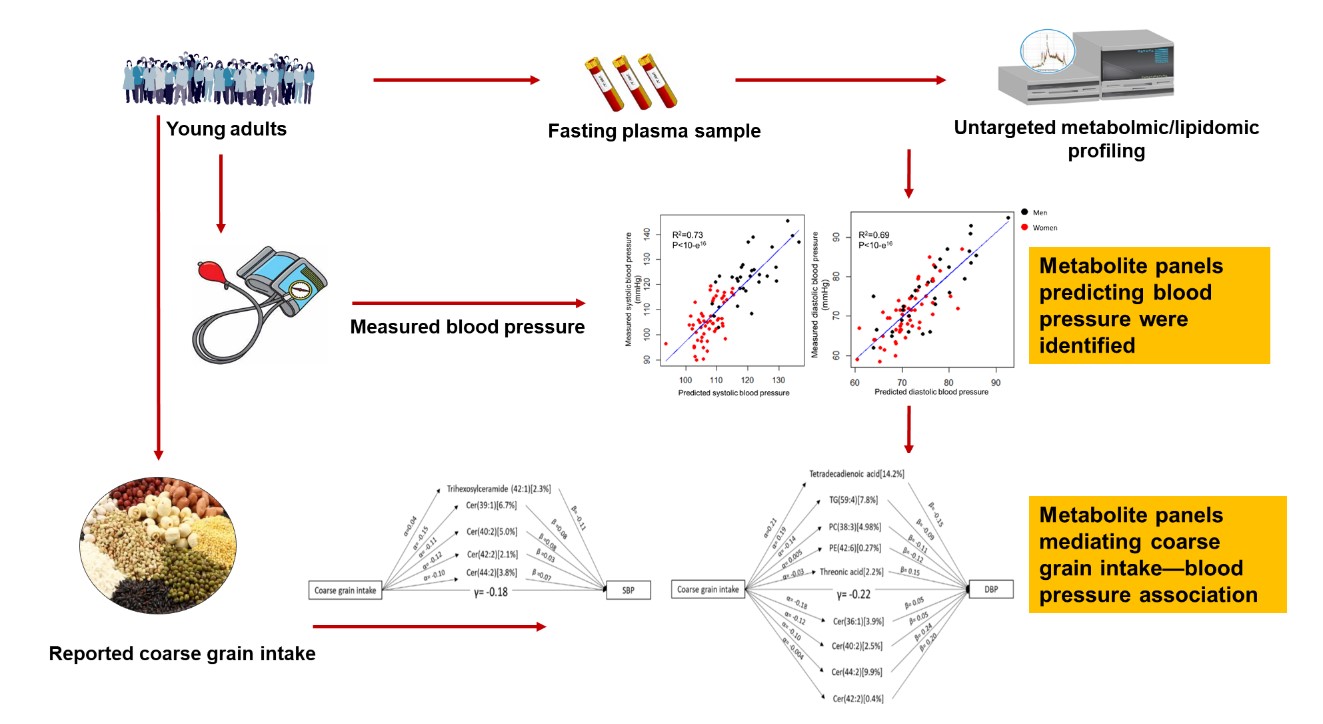 此外,为探索杂粮摄入影响人体血压水平的潜在机制,刘鑫课题组与陕西师范大学食品学院施琳副教授、华大农业应用研究院代晓霜博士合作,在健康青年调查对象中,利用非靶向代谢组/脂质组学技术,探讨了血浆代谢谱/脂质谱在杂粮与血压关联中的作用,该研究首先识别出24种和117种代谢分子分别与收缩压及舒张压显著相关,并发现以神经酰胺类(sphingolipid ceramides)为主的代谢分子群显著介导了杂粮摄入与血压的“保护性”关联规律。我们根据该结果提出假设:增加杂粮摄入或可通过改变人体内神经酰胺类分子参与的代谢网络调控,从而改善血压水平。假设有待良好设计的营养干预试验及分子生物学研究予以证实。该研究论述近日以“Plasma metabolites mediate the association of coarse grain intake with blood pressure in hypertension –free adults”为题发表在营养与代谢领域国际知名期刊Nutrition, Metabolism & Cardiovascular Diseases。