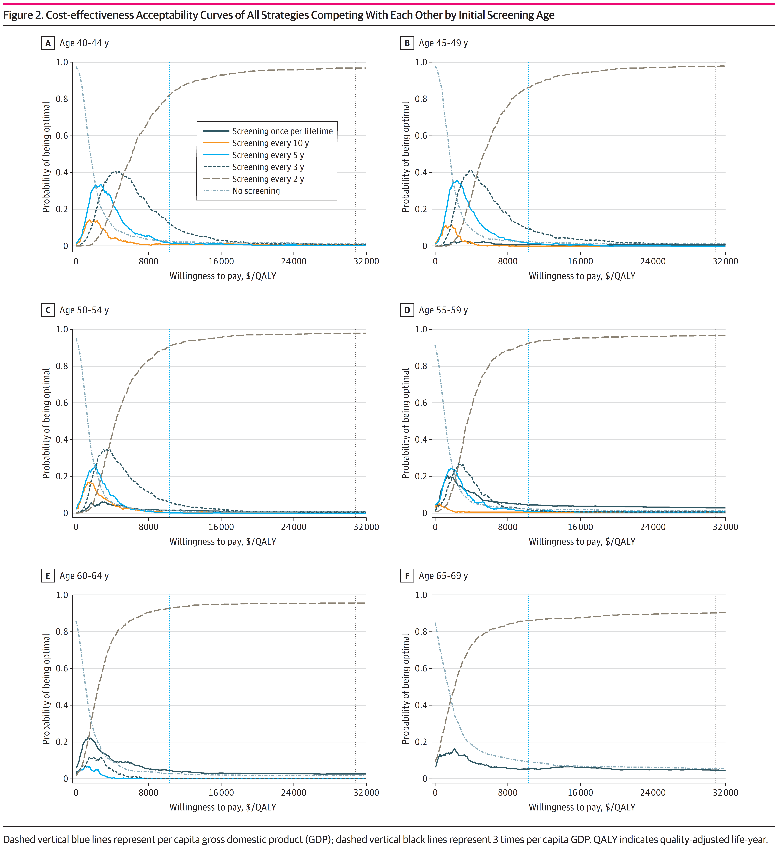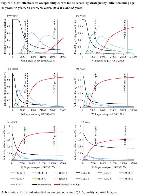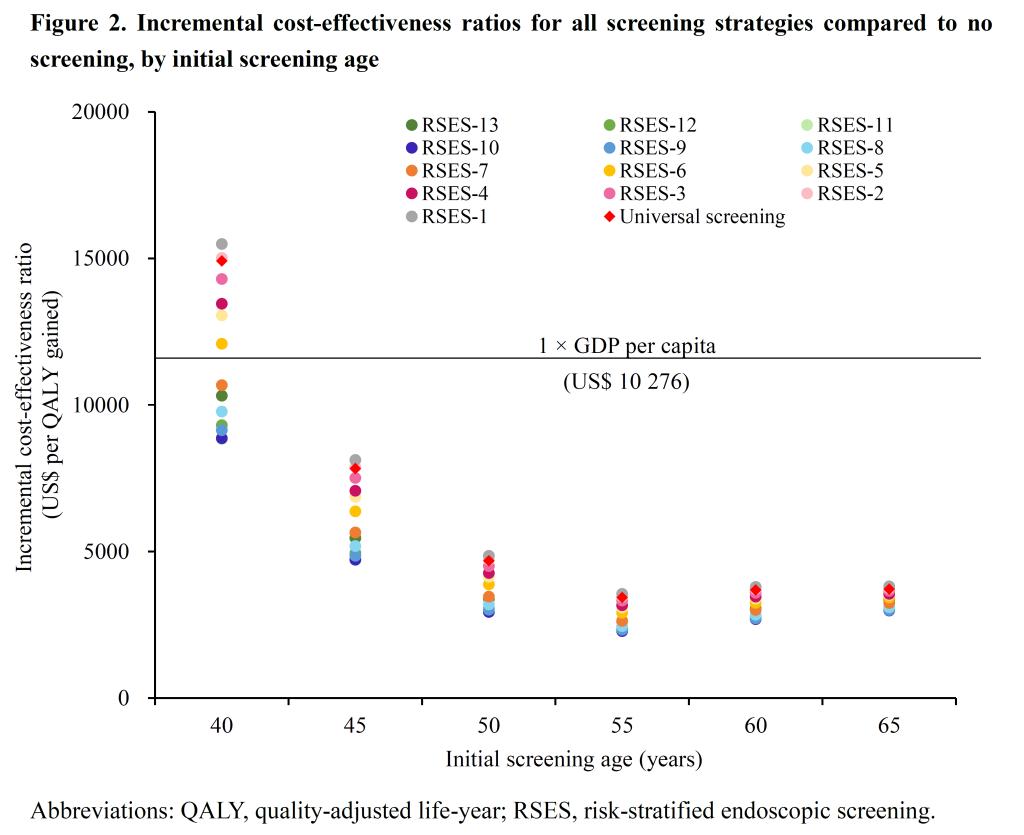 第一篇论文证实:在中国上消化道癌高发区,针对40?69岁人群,内镜同时筛查食管癌和胃癌策略具有高的成本效果,不论哪个初始筛查年龄2年一次内镜筛查均是最佳策略。40?44岁开始2年一次内镜筛查获得健康收益最大,终生一次内镜筛查在65?69岁初始筛查年龄获得健康收益最大。