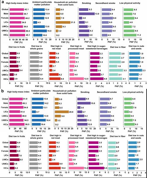 图2 2019年Ⅱ型糖尿病危险因素死亡(a)和DALYs(b)的人群归因分值(PAF)
