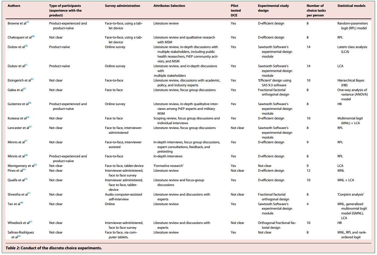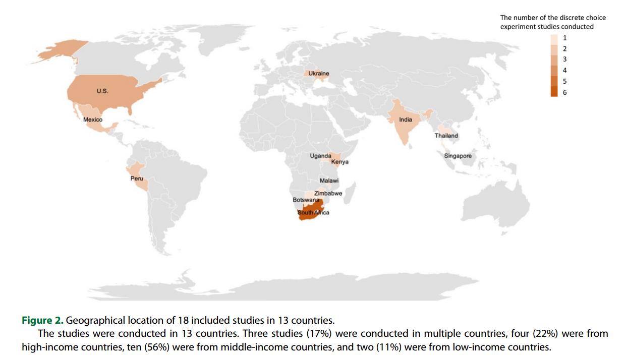 尽管至少有84个国家实施了PrEP计划,120个国家在其国家指南中采用了PrEP建议,但该研究发现,只有来自13个国家的18项研究具有从DCE获得的PrEP偏好数据。相比之下,该研究没有发现来自PrEP使用率较低但关键人群中艾滋病发病率较高的国家的选择偏好数据,如菲律宾。这突出了当前研究中的空白,以及将重点放在人群偏好数据以提高PrEP的可接受性和有效性上的重要性。