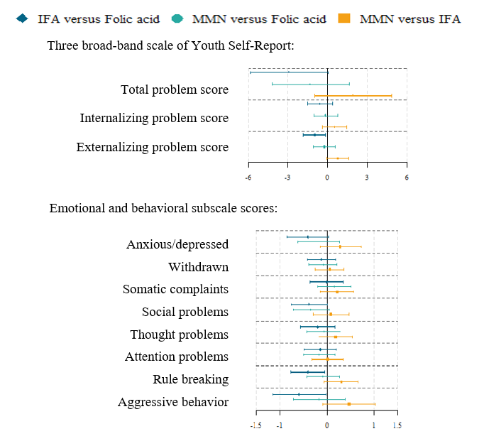 团队前期发表的相关研究论文证实孕期多种微量营养素补充可改善出生结局并对子代的智力发育有长期益处。该研究论文在矫正了关键混杂因素后,进一步证实与叶酸组相比,孕期铁叶酸同补的母亲其子代青少年的总体和外化行为问题评分均较低,呈现出较低的违纪行为和攻击行为得分。此外,在效应修饰分析中发现,多维营养素在较富裕家庭中的有益作用似乎大于铁叶酸和叶酸组。