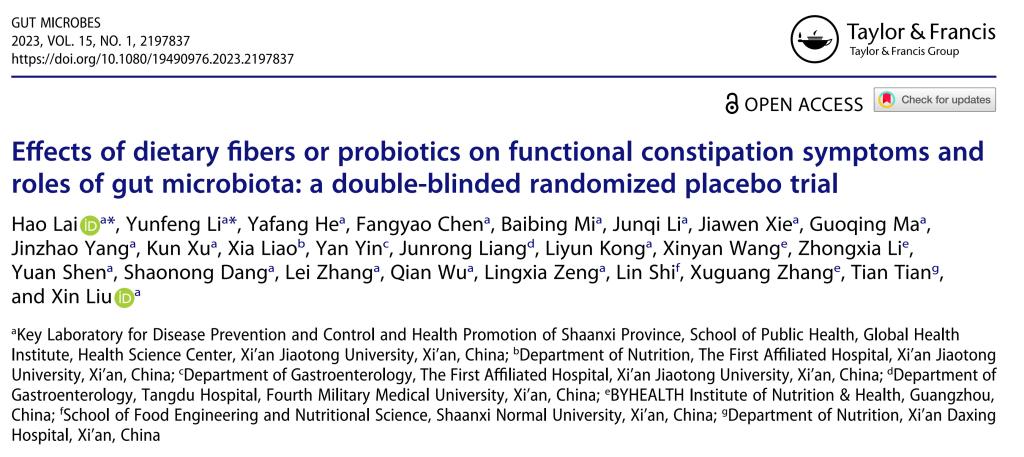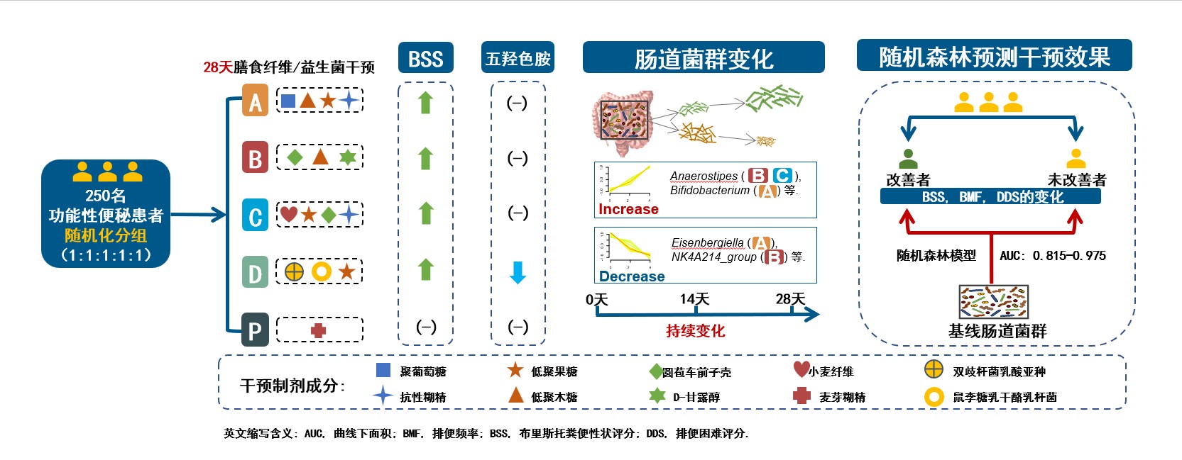 功能性便秘困扰了全球约10%的成年人,肠道菌群紊乱在该疾病的发生发展中扮演了重要角色,膳食纤维或益生菌可调节肠道菌群、缓解便秘症状。然而干预期间肠道菌群是否能持续优化并不清楚,有关“膳食纤维/益生菌-肠道菌群变化-改善便秘”的因果关联轴的随机对照试验证据还非常缺乏。近期,国际肠道健康领域著名期刊Gut Microbes在线发表了公共卫生学院刘鑫副教授团队的研究论文“Effects of dietary fibers or probiotics on functional constipation symptoms and roles of gut microbiota: a double-blinded randomized placebo trial”。该研究在250名功能性便秘的患者中,通过双盲随机对照试验,证实了多种膳食纤维或益生菌组合改善便秘的效果,并发现了一系列肠道微生物的持续改变及其与临床指标的关联规律;同时,通过识别菌群对干预临床效果的预测能力,揭示了口服膳食纤维/益生菌与肠道微生物存在特定的相互作用,进而实现改善肠道健康的效果。