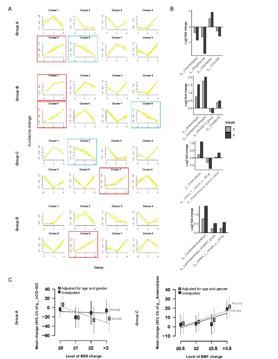 在肠道菌群分析中,聚葡萄糖与低聚糖等干预后(A组),受试者双歧杆菌属呈现持续增加,证实了该组合在功能性便秘患者中的益生元特性。同时,研究者采用趋势聚类分析的方法,鉴定出了14种在干预期间连续增加/减少的肠道菌属。其中粪厌氧棒杆菌属(Anaerostipes)在B组和C组(圆苞车前子壳、小麦纤维等)中均呈现出显著持续增加的趋势,其丰度的变化与患者排便频率的变化正相关。该发现在人类临床试验中找到了膳食纤维通过调节肠道菌群改善便秘症状的直接证据(图2)。