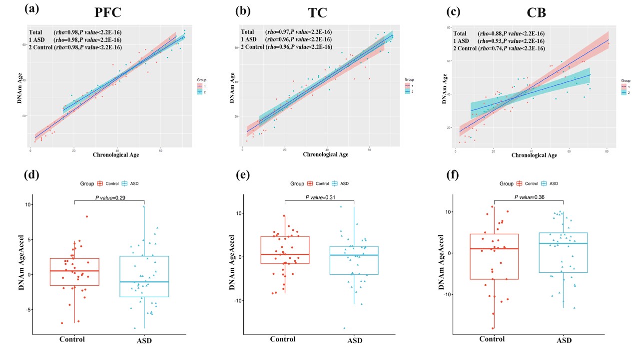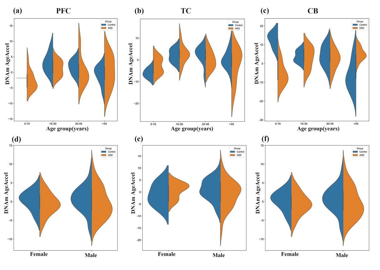 近期研究发现精神分裂症等精神疾病患者的大脑存在系统性的、与年龄相关的生物学变化,但自闭症、精神分裂症患者不同脑区域的衰老特征尚不明确。针对上述问题,公共卫生学院研究人员利用脑组织全基因组DNA甲基化数据集(NASD=222; NSCZ=142),采用Horvath‘s epigenetic clock算法,计算了自闭症患者3个脑区域(小脑、前额叶皮层、颞叶皮层)、精神分裂症患者3个脑区域(小脑、纹状体、海马体)的表观遗传年龄。Horvath表观遗传时钟由353个衰老相关的CpG位点组成,采用了β混合分位数标准化(BMIQ)方法来标准化不同平台获取的DNA甲基化数据。随后,研究者对每个脑区域的甲基化年龄和实际年龄建立回归模型,估算每个脑区域的表观遗传年龄加速度。研究发现在自闭症和精神分裂症患者的不同脑区域中,表观遗传年龄与实际年龄均显著相关,提示表观遗传年龄可作为评估自闭症和精神分裂症患者脑组织衰老速度的指标。研究人员进一步对总样本进行了年龄分层分析,发现与对照组相比,45岁以上的自闭症患者在小脑组织中表现出表观遗传衰老加速,50岁以上的精神分裂症患者小脑区域出现表观遗传衰老减速。对总样本进行性别分层后,在不同脑区域,研究并未观察到男性与女性患者的表观遗传年龄加速度与正常对照存在显著差异。上述研究成果提示自闭症和精神分裂症患者小脑区域偏离了正常老化轨迹,为揭示自闭症和精神分裂症的发生发展机制提供了新的重要科学线索。