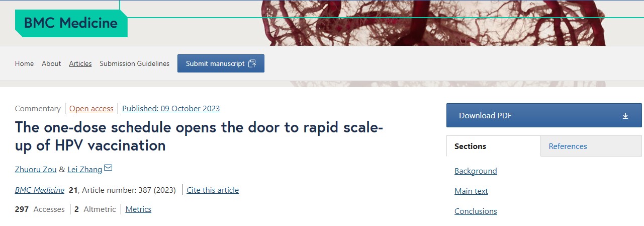 张磊教授团队受BMC Medicine杂志邀请,针对该研究发表了重要评述。该文章于2023年10月9日以《单剂方案开启了快速扩大HPV疫苗接种规模的大门》(The one-dose schedule opens the door to rapid scale-up of HPV vaccination)为题发表在BMC Medicine上的评论(Commentary)专栏,邹卓如博士是第一作者,张磊教授是通讯作者,公共卫生学院是通讯作者单位。