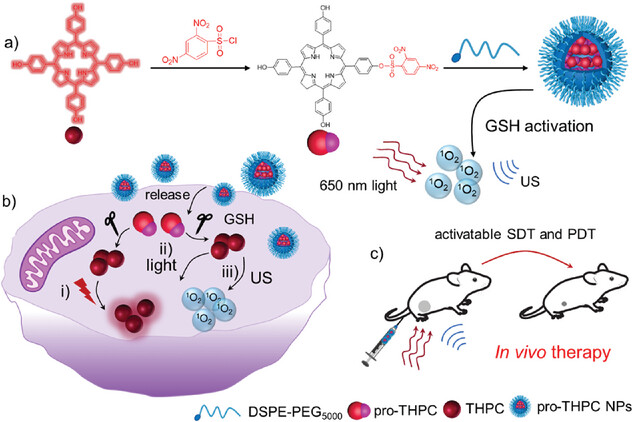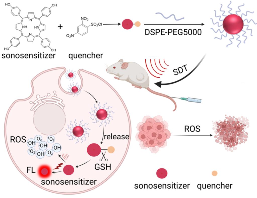 光动力学治疗利用外部光照刺激光敏剂生成活性氧(ROS),实现肿瘤细胞的杀伤,具有非侵入性、时空可控性和低毒副作用的优点。然而,由于光进入组织的穿透深度有限,它在治疗深层病理组织方面的有效性受到限制。另一方面,声动力疗法(SDT)使用超声波(US)作为外部刺激来触发声敏剂来杀伤肿瘤细胞,具有超过10厘米的出色穿透深度。SDT优越的组织穿透深度可以克服PDT的局限性,使SDT和PDT的结合能够利用超声和光刺激的互补作用,实现最佳的治疗效果。然而,光敏剂和声敏剂都不可避免地通过血液循环扩散和分布到正常组织和器官。PDT过程中的光散射和和SDT所产生的气泡爆炸释放的强大能量会导致非特异性ROS的产生,对肿瘤邻近的健康组织的产生毒副作用。基于这个问题,公共卫生学院安菲菲课题组开展了一系列的探索工作。
