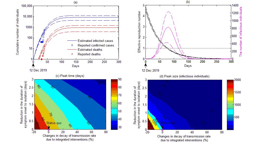 2020年1月23日,西安交通大学公共卫生学院张磊教授和沈明望副教授,数学与统计学院肖燕妮教授,与南京医科大学公共卫生学院彭志行教授合作利用数学模型对2019-nCov在中国的流行趋势进行了预测。该研究利用2020年1月22日前累积报告的确诊病例和死亡病例数据,建立了传播动力学模型。模型中假设了传染率系数随着综合控制措施(包括隔离,交通管制,戴口罩等)越来越严格而呈指数衰减,并基于报告数据估计了这个衰减率。在此基础上,估计了疾病传播的基本再生数为4.71 (4.50-4.92),即在没有干预的情况下,所有人都是易感人群时,一个感染者平均能传染4.71个人。随着干预增强,再生数(此时叫有效再生数)于2020年1月22日已降至2.08 (1.99-2.18),预期在2月27日前后(2月25日-3月1日)降到1以下,随后疾病逐渐消除。在参数基准取值下,预期疾病高峰在2月底来临。通过敏感性分析发现进一步缩短从感染到被隔离的时间、增强综合控制措施的强度(即增大传染率系数的衰减率)可以使疾病峰值提前5-14天到来,并且会有效减少峰值个案数,总感染人数和死亡人数。由于当前报告数据有限,上述结果仅作参考,后续将继续基于更新的数据不断调整优化模型参数进一步评估疫情发展趋势。