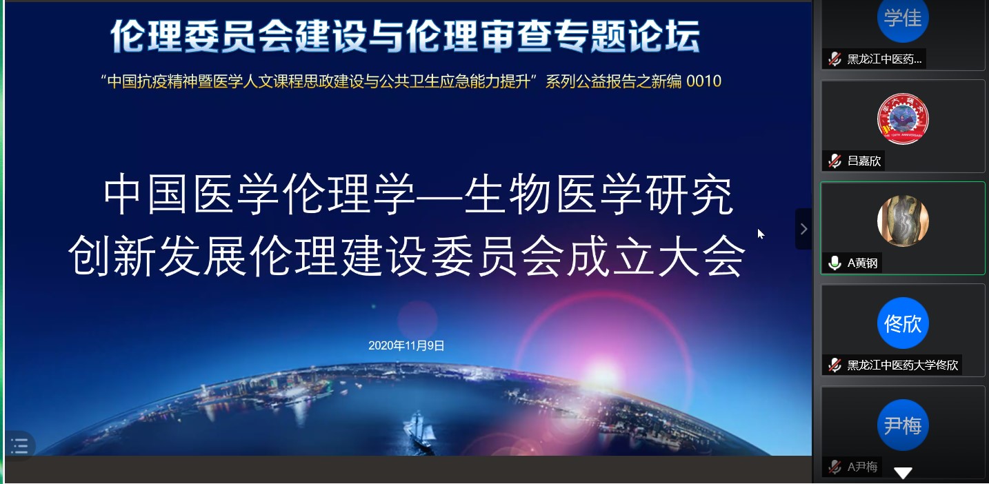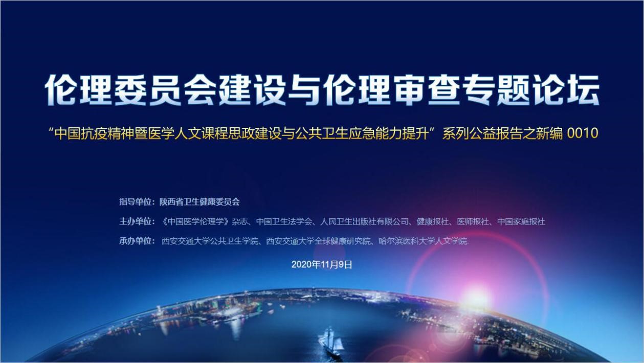 2020年11月9日,由陕西省卫生健康委员会指导,《中国医学伦理学》杂志、中国卫生法学会、人民卫生出版社有限公司、健康报社、医师报社、中国家庭报社等联合主办,西安交通大学公共卫生学院、西安交通大学全球健康研究院、哈尔滨医科大学人文学院等联合承办,潍坊医学院、陕西中医药大学人文管理学院、南方医科大学通识教育部、北京经纬传奇医药科技有限公司、锦州医科大学人文与管理学院、河北省邯郸市涉县中医院等联合协办的伦理委员会建设与伦理审查专题论坛,在西安交通大学医学部成功召开。