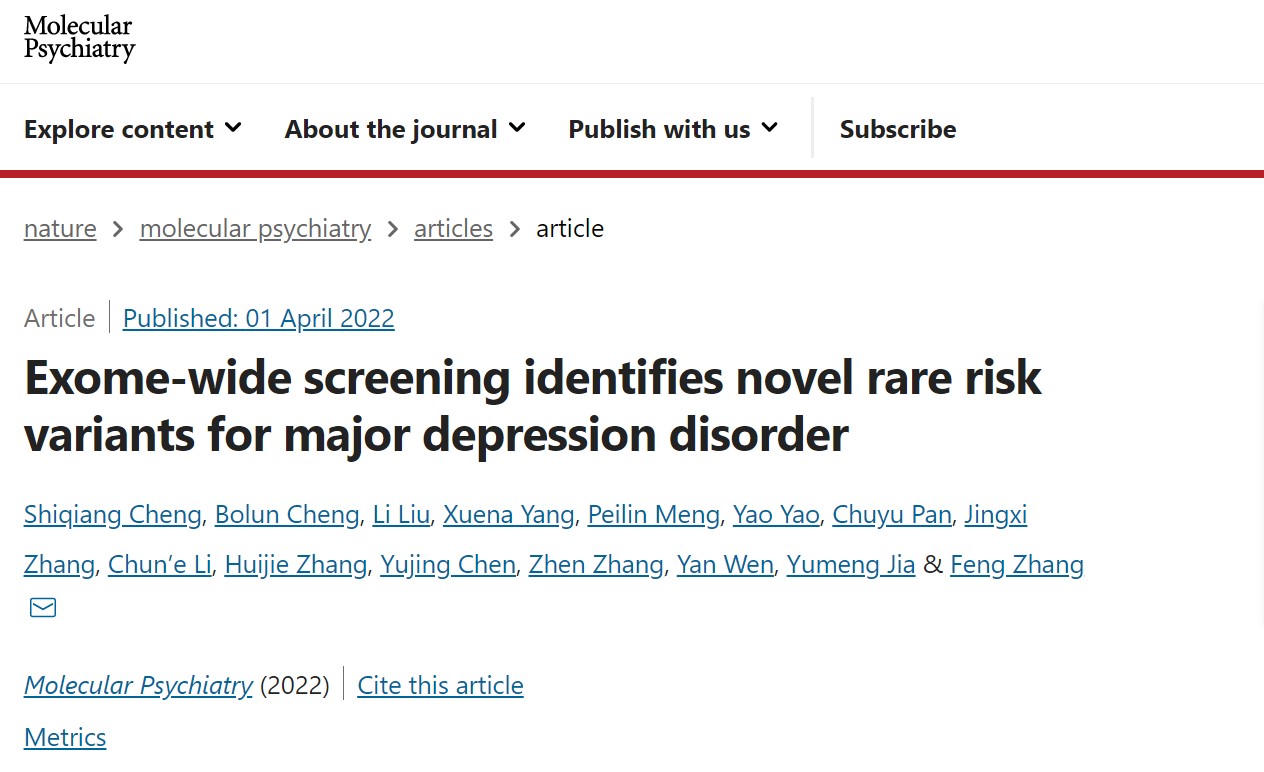 该成果以“Exome-wide screening identifies novel rare risk variants for major depression disorder”为题在精神病研究领域权威期刊Molecular PsychiatryIF=15.99)在线发表。公共卫生学院博士生程仕强是论文的唯一第一作者,张峰教授是论文的唯一通讯作者。西安交通大学医学部公共卫生学院、国家卫健委微量元素与地方病研究重点实验室、教育部环境与疾病相关基因重点实验室、陕西省疾病防控与健康促进重点实验室为论文的第一作者和通讯作者单位。上述工作得到了国家自然科学基金优青项目的资助。
