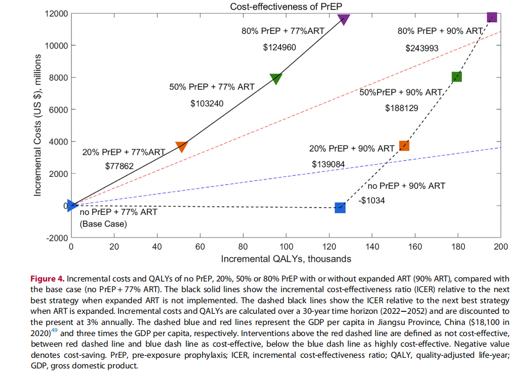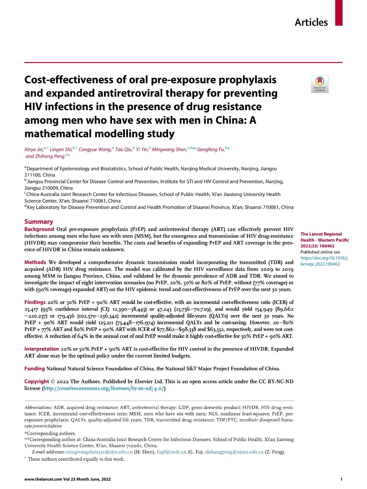 抗病毒治疗(Antiretroviral therapy, ART)是目前控制艾滋病流行最有效的方式之一,但是ART无法彻底根除患者体内的病毒,导致患者不得不终生服用药物,这不仅带来极大的毒副作用,造成依从性的下降,而且也难以避免导致耐药型HIV的产生和传播。暴露前预防(Pre-exposure prophylaxis,PrEP)是对目前艾滋病防控措施的有效补充,多个大规模随机对照试验表明针对男男同性性行为人群(Men who have sex with men, MSM)使用口服PrEP药物可以有效降低HIV感染风险,但是口服PrEP药物价格昂贵,在考虑耐药型HIV的产生和传播等因素下,中国MSM人群中采取此预防措施是否具有成本-效果(cost-effective)仍不清楚。为此,西安交通大学公共卫生学院中澳传染病联合研究中心沈明望副教授与南京医科大学公共卫生学院彭志行教授、江苏省疾控中心性病与艾滋病预防控制所所长傅更锋教授合作,在Lancet Regional Health-Western Pacific(《柳叶刀-区域健康(西太平洋)》)杂志在线发表了题为“Cost-effectiveness of oral pre-exposure prophylaxis and expanded antiretroviral therapy for preventing HIV infections in the presence of drug resistance among men who have sex with men in China: A mathematical modelling study”的研究成果。南京医科大学公共卫生学院硕士生金新叶和江苏省疾控中心史灵恩是共同第一作者,沈明望副教授是第一通讯作者,西安交通大学公共卫生学院是第一通讯作者单位,彭志行教授和傅更锋所长是共同通讯作者。该研究由三位通讯作者共同选题,金新叶同学2021年5月-9月在西安交通大学公共卫生学院访学期间,在合作导师沈明望副教授的指导下完成主要的模型构建、数据拟合、参数估计、成本效果分析和初稿撰写等工作。