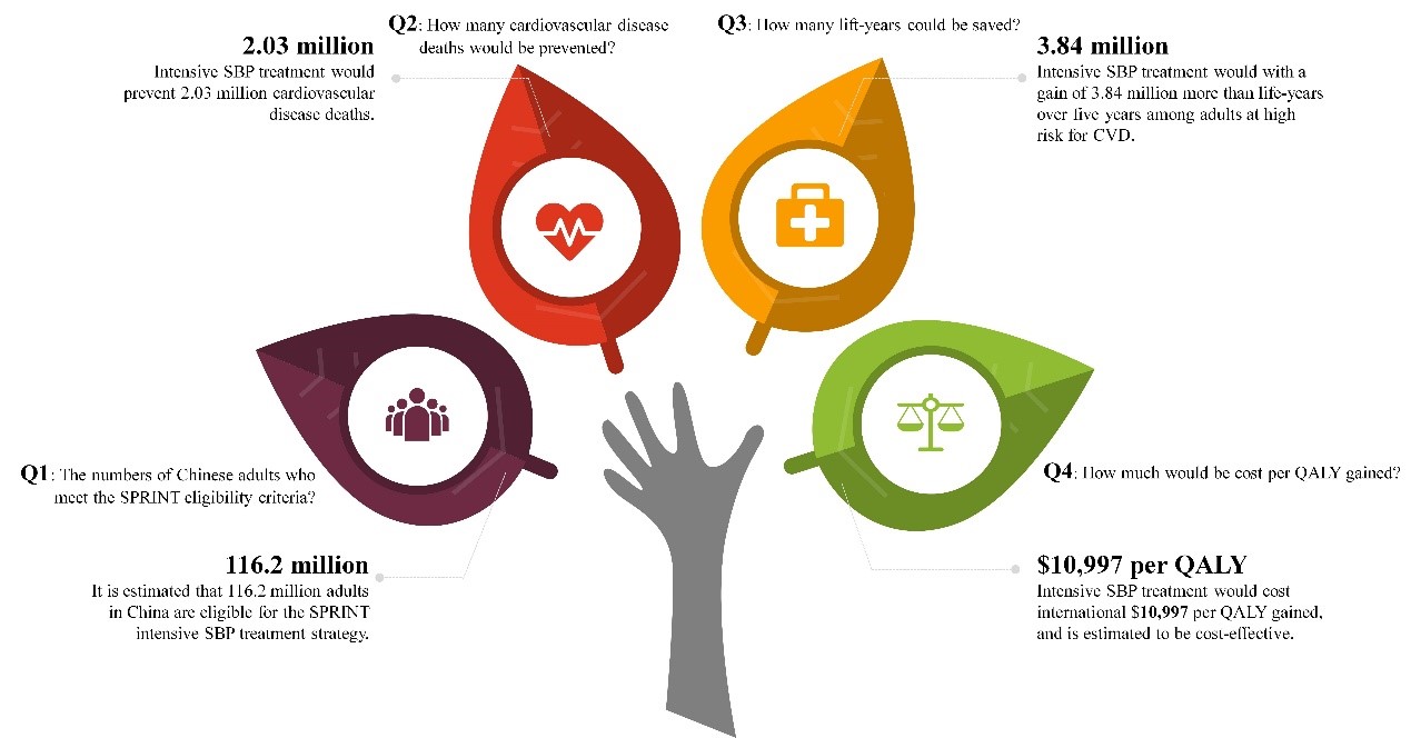 越来越多的临床研究结果证实强化血压控制相比于常规血压控制策略能够显著降低心血管病(CVD)发病和死亡的风险,相关研究结果深远地影响了各国高血压防治指南的制定。为此,公共卫生学院李超副教授与利物浦大学陈涛教授及利物浦热带病医学院王多劳教授团队合作,针对强化血压控制策略对老年人群干预的起效时间、血压控制的适宜范围及在我国开展后的成本效果等问题开展研究,相关研究结果在JAMA Internal Medicine、BMC Medicine和PloS Medicine期刊发表。