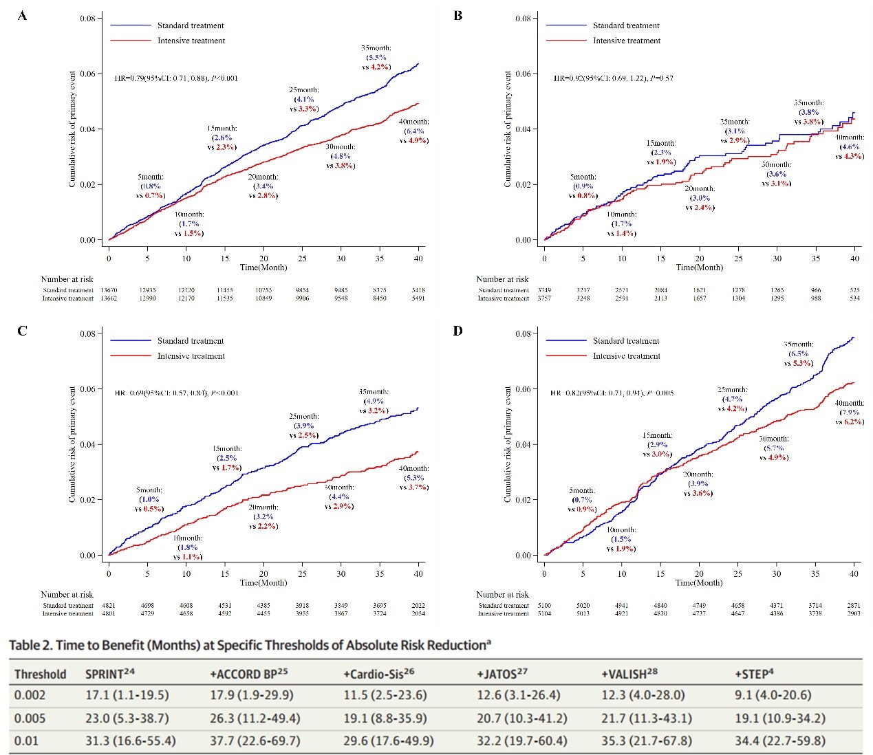 研究通过重构既往相关临床试验的原始数据(共计27414名老年受试对象)并采用Time to Benefit(TTB)指标评价强化血压控制组相比常规血压控制组达到指定差异阈值的时间。结果显示:1、严格血压控制策略的降压目标值为130 mm Hg和120 mm Hg时,相比常规血压控制策略能够显著降低老年人群(>60岁)主要心血管事件及死亡的发生风险;2、严格血压控制策略实施后,每千人中观察减少两例心血管事件及死亡发生(Threshold=0.002)的时间为9.1月。研究结果为指导老年人群强化血压干预的临床实践提供了重要的理论依据。