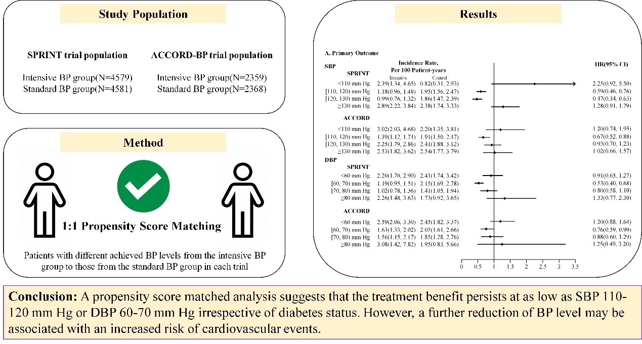 按严格血压控制组的实际降压水平将该组受试对象分成收缩压<110 mm Hg、110-120 mm Hg、120-130 mm Hg、≥130 mm Hg;舒张压<60 mm Hg、60-70 mm Hg、70-80 mm Hg、≥80 mm Hg;共八个亚组,采用倾向性评分法为不同组的受试对象匹配信息相近的人群作为对照。结果显示:1、CVD高风险人群合并糖尿病的血压适宜目标为收缩压110-130 mm Hg,舒张压60-70 mm Hg;2、CVD高风险未合并糖尿病人群的血压适宜目标为收缩压110-120 mm Hg,舒张压60-70 mm Hg。该结果为不同人群严格血压策略降压目标范围的制定提供了重要参考。