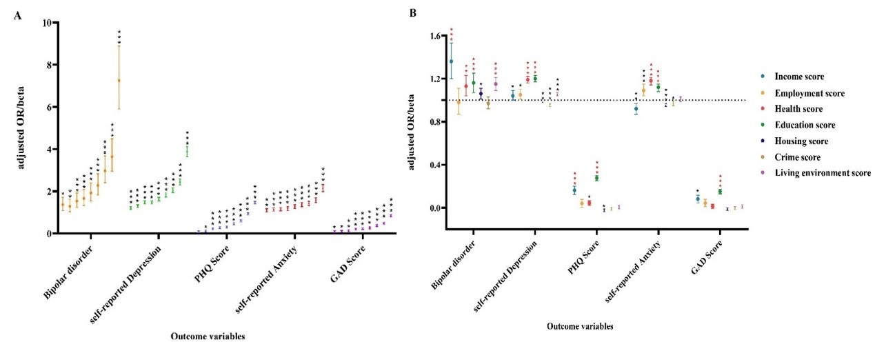 为了明确社会经济环境对精神健康的影响,研究人员基于英国生物银行(UK Biobank)公共数据,采用回归模型系统分析了复合剥夺指数(Index of Multiple Deprivation,IMD)与三种常见精神疾病的相关性。结果发现较高的IMD与双相情感障碍、抑郁症和焦虑症的患病风险升高显著相关。为了进一步探索社会经济环境影响精神健康的生物学机制,研究人员以IMD剥夺指数作为环境暴露因素,进行了全基因组环境-基因交互作用研究,结果发现社会经济劣势与DAB1、GTDC1、CDH4等多个基因存在显著的环境-基因交互作用,影响双相情感障碍、抑郁症和焦虑症的患病风险。该研究证实了社会经济环境对精神健康的显著影响,同时发现了多个与复合剥夺指数存在交互致病作用的候选易感基因,为揭示社会经济环境影响精神健康的生物学机制提供了新的科学线索。