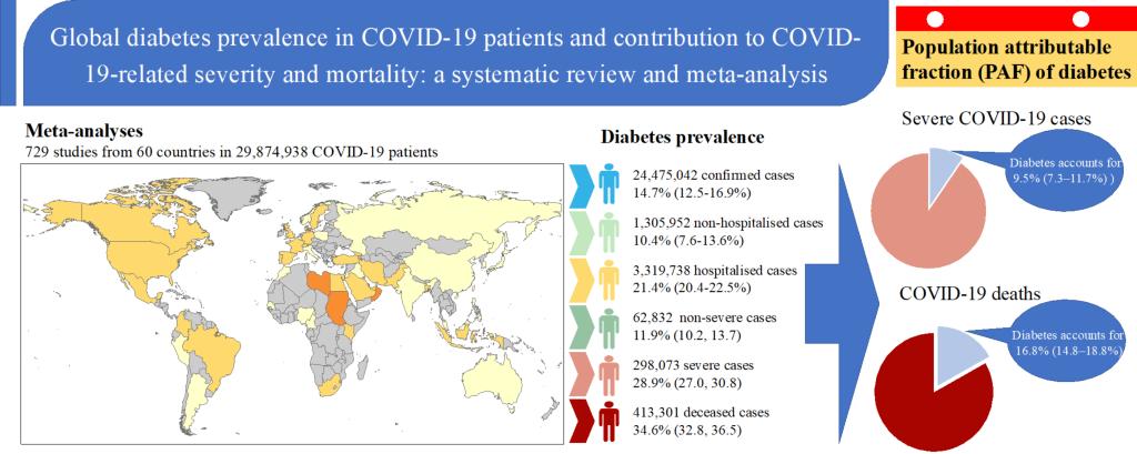 根据国际糖尿病协会最新报告,全球现有5.37亿成年糖尿病患者(患病率达1/10)。糖尿病患者感染新冠病毒后更容易发生严重不良临床结局(如重症、死亡),然而尚未有研究对糖尿病患者感染新冠后的疾病负担进行定量评估。为此,西安交通大学公共卫生学院科研团队在全球及不同地区国家开展了相关系统评价和疾病负担归因分析研究。最近,研究成果以《全球新冠人群中糖尿病患病率及其引起的新冠相关重症和死亡疾病负担评估——系统评价和荟萃分析》(Global Diabetes Prevalence in COVID-19 Patients and Contribution to COVID-19–Related Severity and Mortality: A Systematic Review and Meta-analysis)为题在糖尿病领域顶尖期刊《糖尿病治疗》(Diabetes Care)发表。
