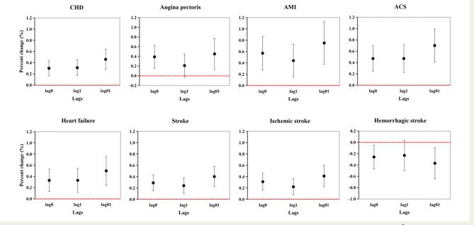 图1. 不同时间窗(lag0、lag1和lag01分别代表滞后0天、滞后1天、2天平均)每日8h最高O3浓度每增加10 μg/m3对应的主要心血管疾病日住院率变化(结果为百分比变化及95%置信区间)