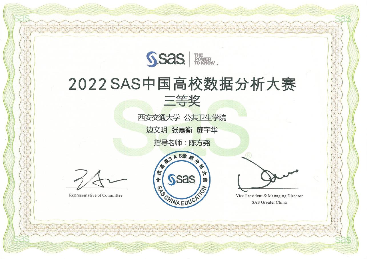 公共卫生学院19级预防医学专业本科生边文明、廖宇华、张嘉衡在2022年SAS中国高校数据分析大赛中获得佳绩。