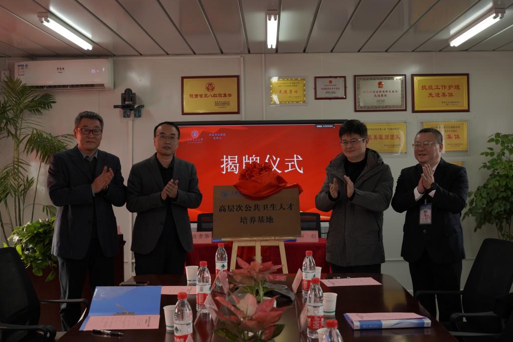 庄贵华教授同郝剑院长共同签署合作协议,在多方共同见证下,雷利利主任、杨国梁主任共同为高层次公共卫生人才培养基地揭牌。