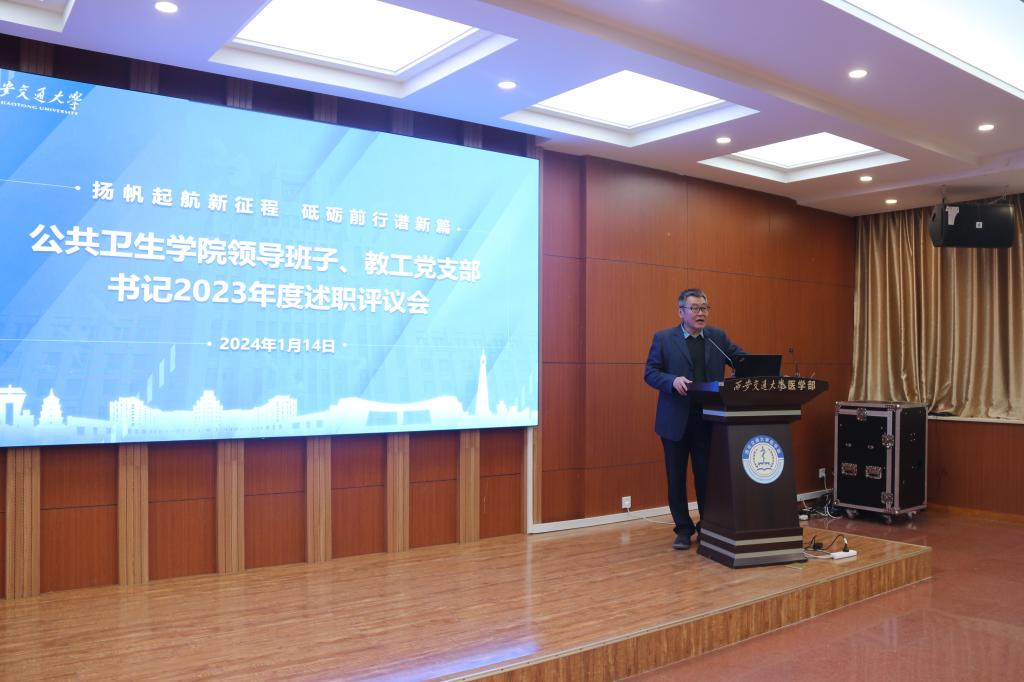 1月14日,公共卫生学院召开2023年度全院教职工大会,全面总结2023年度学院工作,安排部署2024年工作重点,进行学院领导班子、处级干部、教工党支部书记述职评议。会议由学院书记兼院长庄贵华教授主持。