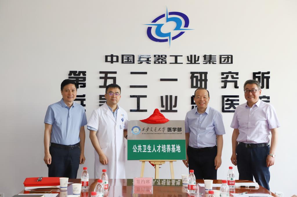 2024年5月20日,西安交通大学医学部与兵器工业卫生研究所(兵器工业521所)“公共卫生人才培养基地”签约暨揭牌仪式在521所科研试验楼举办。西安交通大学党委常委、医学部党委书记陈腾、公共卫生学院书记兼院长庄贵华、医学部人才培养处副处长吴小健、科学技术与学科建设处副处长吴斌和公共卫生学院相关院系负责人,521所所长张朝、书记虞青松等参会。