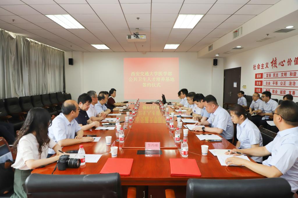 虞青松与庄贵华签署了合作协议,与张朝、陈腾共同为“西安交通大学医学部公共卫生人才培养基地”揭牌。