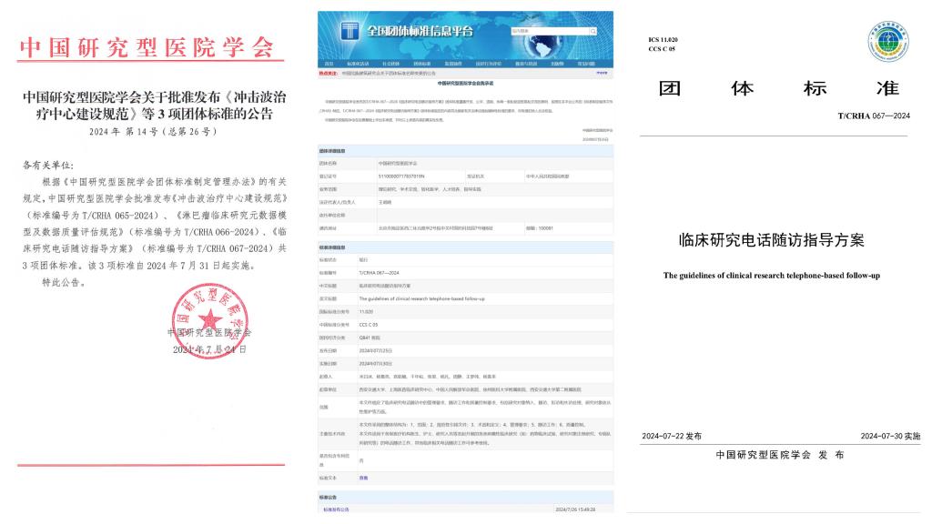 近日,由西安交通大学公共卫生学院牵头并联合国内多家知名研究型医院和科研单位组织制定的《临床研究电话随访指导方案》(T/CRHA 067-2024)正式由中国研究型医院学会批准发布。
